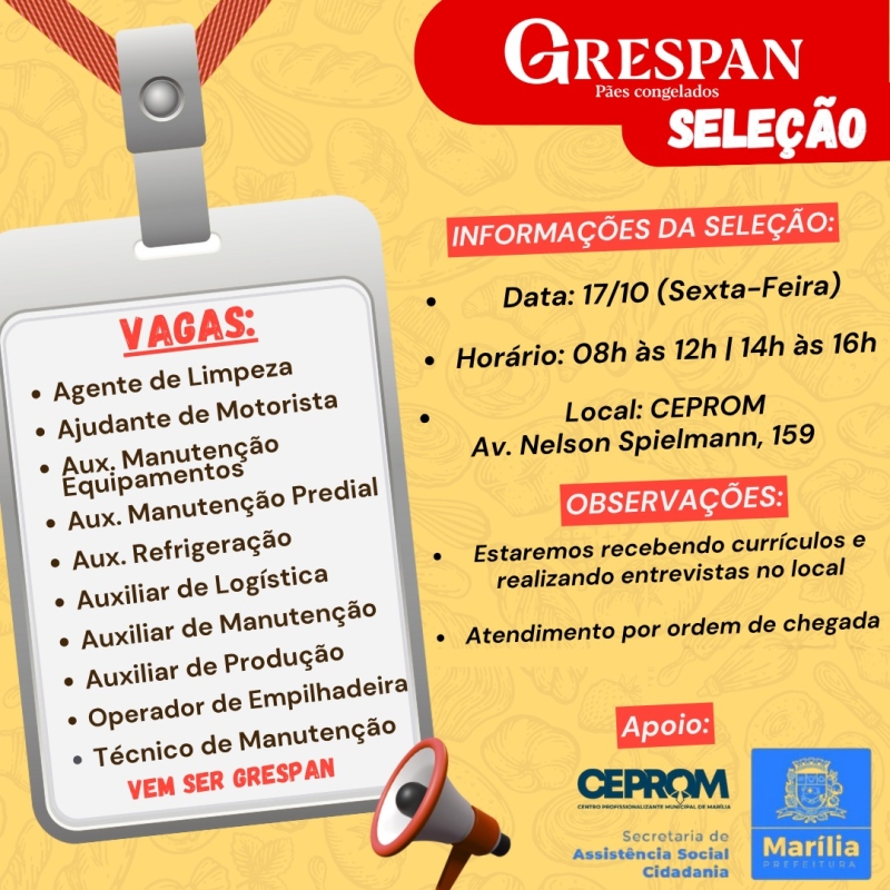 Nesta edição, o evento conta com a parceria da empresa Grespan ‒ Pães Congelados, que oferecerá diversas oportunidades de trabalho. Serão disponibilizadas vagas para os cargos de agente de limpeza, ajudante de motorista, auxiliar de manutenção de equipamentos, auxiliar de manutenção predial, auxiliar de refrigeração, auxiliar de logística, auxiliar de manutenção, auxiliar de produção, operador de empilhadeira e técnico de manutenção.