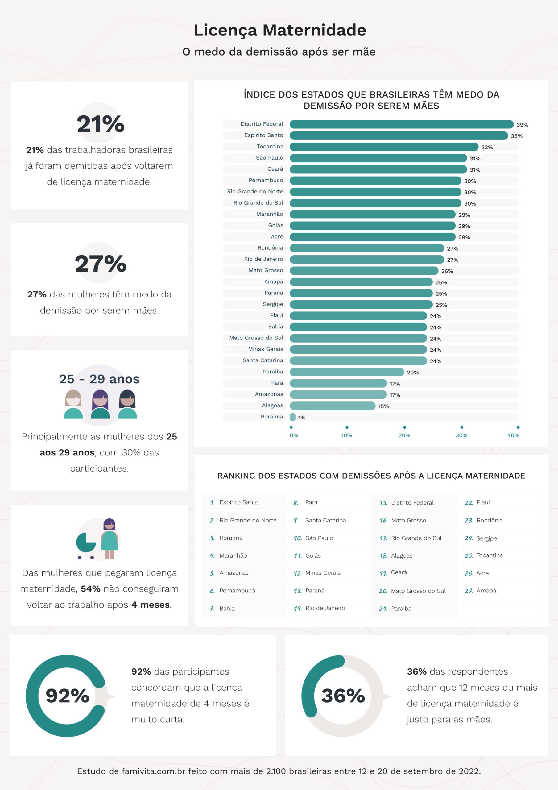 Por faixa etária, o estudo apontou que as mulheres que menos foram demitidas, depois da licença, têm entre 35 e 39 anos, sendo 84% das entrevistadas. Já os dados por estado demonstraram que os locais onde ocorreram mais demissões foram Espírito Santo, Rio Grande do Norte e Roraima. Em Tocantins, Acre e Amapá é onde houve menos ocorrências nesse sentido.