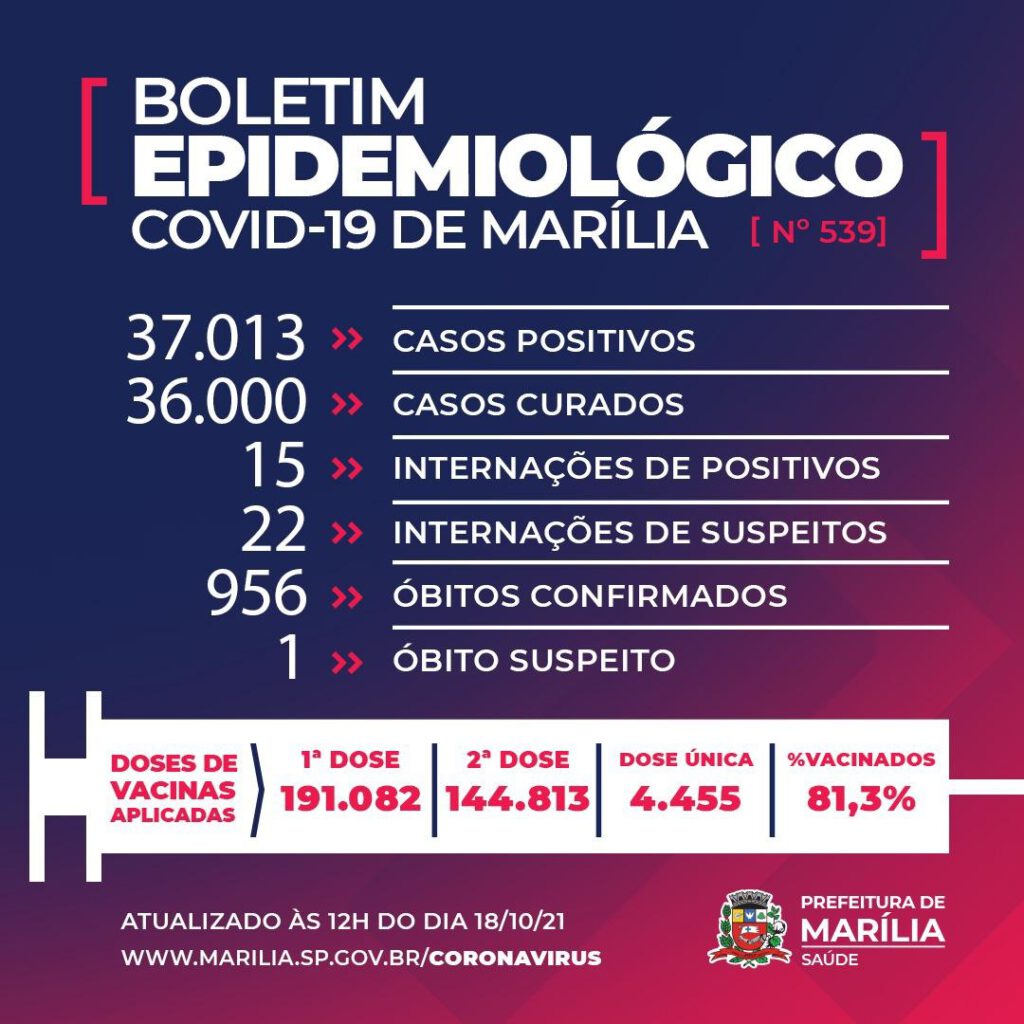A Prefeitura de Marília confirmou na manhã desta segunda-feira, dia 18 de outubro, mais uma morte por Covid-19, chegando a 956 óbitos pela doença no município, incluindo o final de semana.
