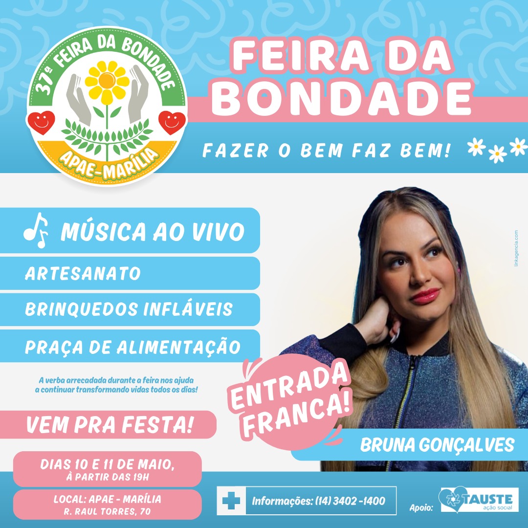 A Associação de Pais e Amigos dos Excepcionais (Apae) de Marília, realiza nos dias 10 e 11 de maio a tradicional Feira da Bondade. O evento chega em sua 37ª edição com o mesmo objetivo: ajudar a transformar vidas dos alunos excepcionais e para isso, uma mega infraestrutura será montada para os dois dias de feira e diversão.