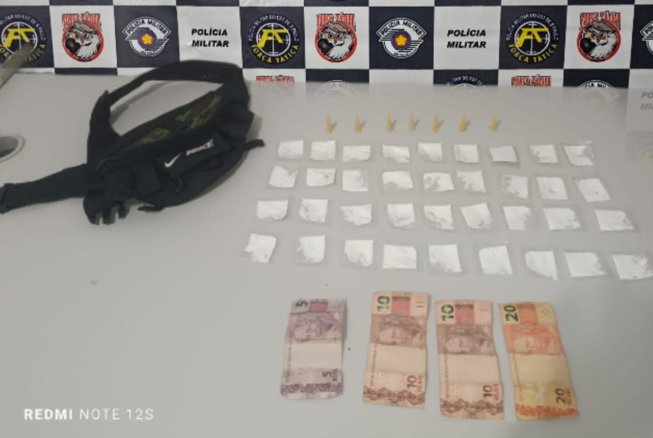 O adolescente foi abordado e, durante a busca pessoal, foram encontradas com ele 4 porções de cocaína embaladas a vácuo e a quantia de R$ 45,00. Além disso, os policiais localizaram uma pochete contendo 32 porções de cocaína embaladas a vácuo e 7 pinos com crack. Ao ser questionado, o adolescente confessou que estava realizando a venda de drogas.