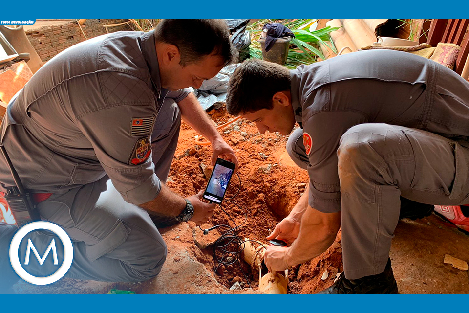 O animal ficou preso entalado a mais ou menos 5 metros para dentro da tubulação que liga a casa até a rua. Com a ajuda de uma microcâmara foi possível localizar com exatidão onde o animal estava.