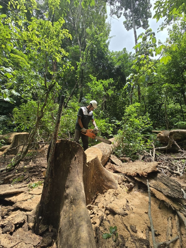 As equipes identificaram árvores de grande porte nativas e exóticas que estavam com o estado fitossanitário comprometido. Entre elas, exemplares com infestação de cupins, troncos ocos e indivíduos já secos, todos apresentando risco iminente de queda em áreas de intenso fluxo de pessoas que caminham e circulam diariamente pelo bosque.