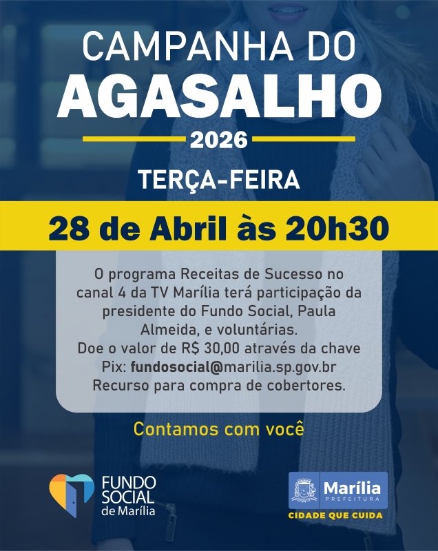 Com o objetivo de aquecer o inverno das famílias em situação de vulnerabilidade, o Fundo Social de Marília intensifica as ações da Campanha do Agasalho 2026. Nesta terça-feira, dia 28 de abril, às 20h30, a iniciativa terá um destaque especial durante o programa “Receitas de Sucesso”, exibido pelo Canal 4 da TV Marília.