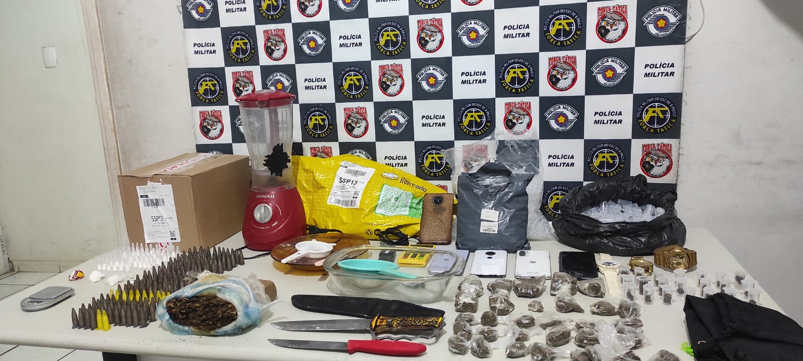 No local, foram apreendidos um tijolo de maconha, 202 porções de cocaína, três porções brutas de cocaína, cinco celulares, uma máquina de cartão, três relógios de pulso, uma balança de precisão e ferramentas usadas para o preparo das drogas, como liquidificador, facas e peneiras. Além disso, 3 mil microtubos vazios, adquiridos em uma plataforma de e-commerce no nome da mulher, também foram encontrados.