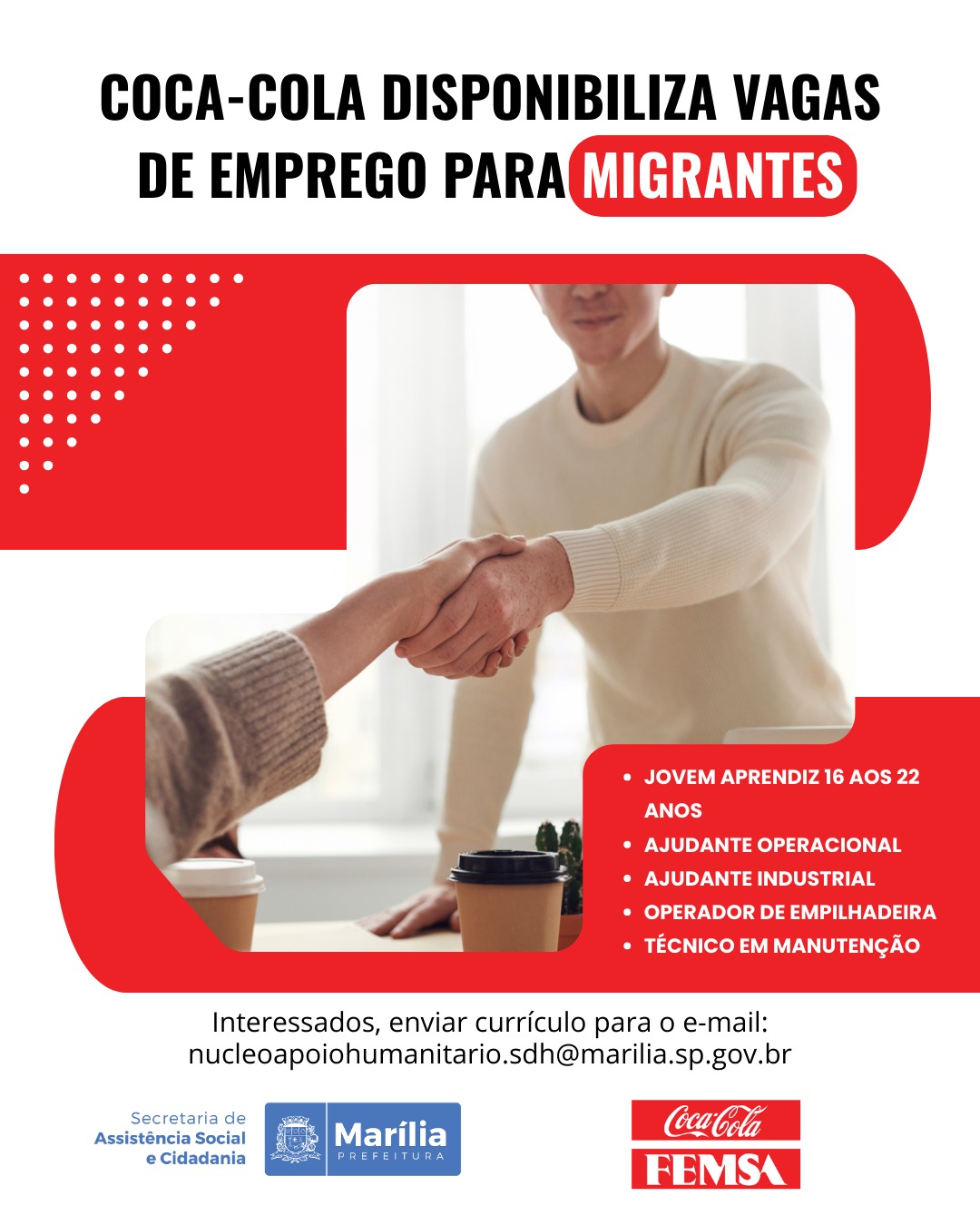 Em uma iniciativa voltada à inclusão social e ao fortalecimento da economia local, a Coca-Cola FEMSA, em parceria com a Prefeitura Municipal de Marília, por meio da Secretaria de Assistência Social e Cidadania, anunciou a abertura de um processo seletivo destinado especificamente à população migrante residente na cidade.