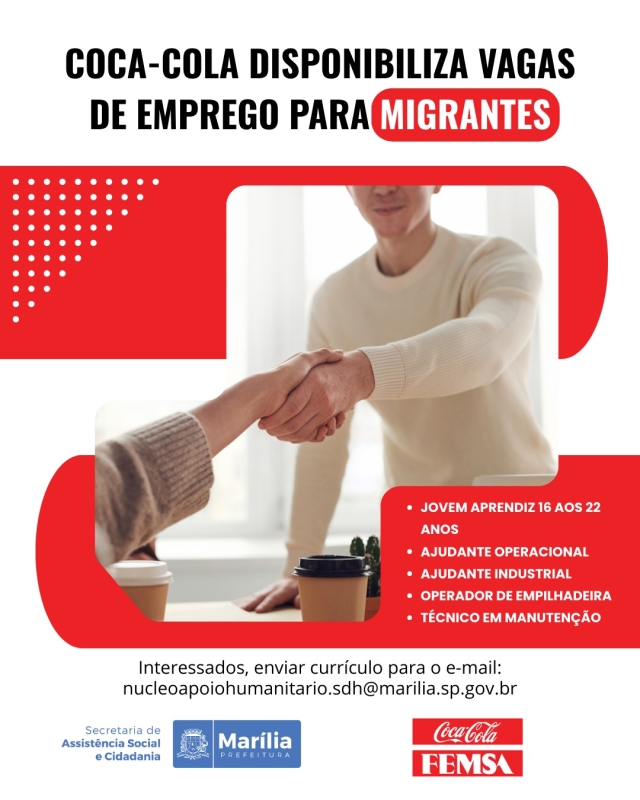 Em uma iniciativa voltada à inclusão social e ao fortalecimento da economia local, a Coca-Cola FEMSA, em parceria com a Prefeitura Municipal de Marília, por meio da Secretaria de Assistência Social e Cidadania, anunciou a abertura de um processo seletivo destinado especificamente à população migrante residente na cidade.