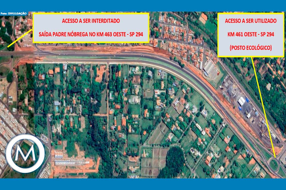 A Concessionária Eixo São Paulo comunica que a partir da próxima segunda-feira, dia 23 de outubro de 2023, o acesso à rodovia João Ribeiro de Barros, a SP-294, pela alça do distrito de Padre Nóbrega, na região Norte de Marília, estará temporariamente fechado. O bloqueio do chamado ‘trevo de Nóbrega’ será na pista Leste, sentido Oriente.