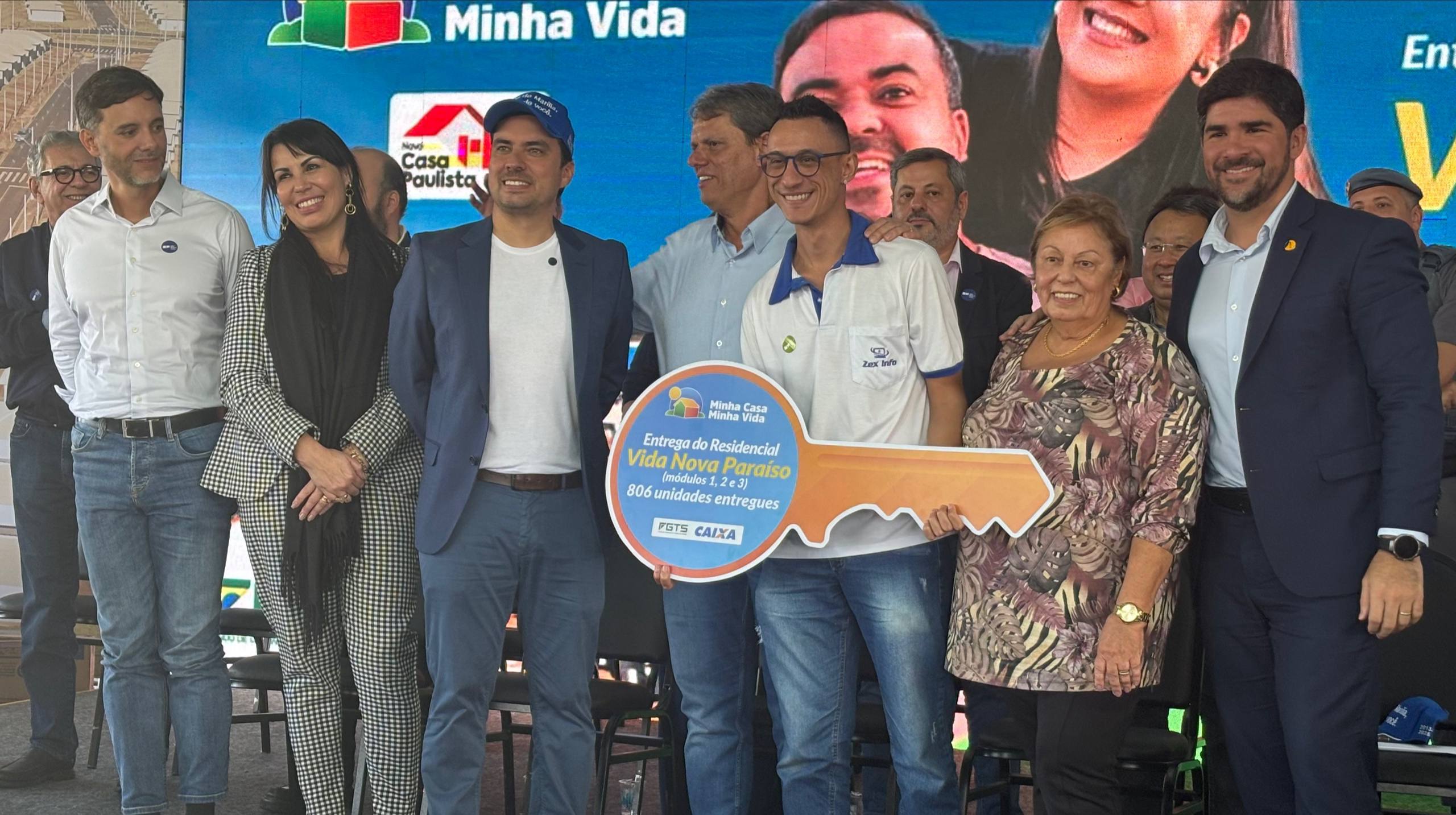 O prefeito Vinicius Camarinha recebeu o governador de São Paulo, Tarcísio de Freitas, para entrega de 806 casas no Residencial Vida Nova Paraíso, bairro planejado construído pela empresa Pacaembu na zona Norte da cidade. O evento de entrega das chaves foi realizado no próprio bairro no período da manhã desta sexta-feira (27), e contou também com a presença do secretário nacional de Habitação, Augusto Rabelo – representando o Ministério das Cidades; do secretário de Desenvolvimento Urbano e Habitação do Estado de São Paulo, Marcelo Branco; da superintendente de Redes da Caixa Econômica Federal, Ana Paula da Silva; de membros da diretoria da Pacaembu Construtora; do vice-prefeito Rogério Alexandre, além de secretários municipais e vereadores de Marília, e prefeitos da região.