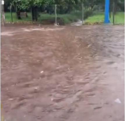 Vídeos feitos por moradores nas redes sociais mostram a rua completamente tomada pela enxurrada, com a água chegando até a altura do tornozelo e transformando a via em um verdadeiro rio improvisado.