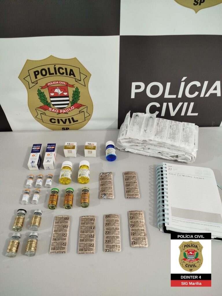 Durante as buscas, foram encontrados nove frascos de substâncias que atuam no controle do apetite, digestão e níveis de insulina. Além disso, os policiais apreenderam diversos anabolizantes, como testosterona, oxandrolona, nandrolona e metandrostenolona, disponíveis tanto em comprimidos quanto em versões injetáveis. Parte do material estava guardada na geladeira, enquanto o restante foi localizado em uma caixa na sala do imóvel.