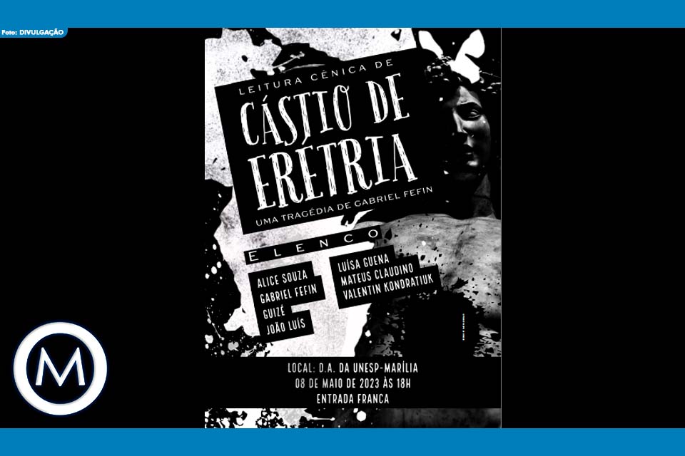 Escrita em 2021 por um jovem autor de Votuporanga, a peça Cástio de Erétria será apresentada na UNESP de Marília em um formato dinâmico de leitura dramática conjugada a elementos teatrais, tais como iluminação, figurinos e movimentação cênica. A peça faz parte de um ciclo que acontece há dez anos nesta universidade, durante os quais foram apresentadas mais de 80 leituras dramáticas de peças nacionais e estrangeiras. Cástio de Erétria tem à frente um elenco de sete estudantes universitários sob direção de Ana Portich, professora do Departamento de Filosofia da UNESP.
