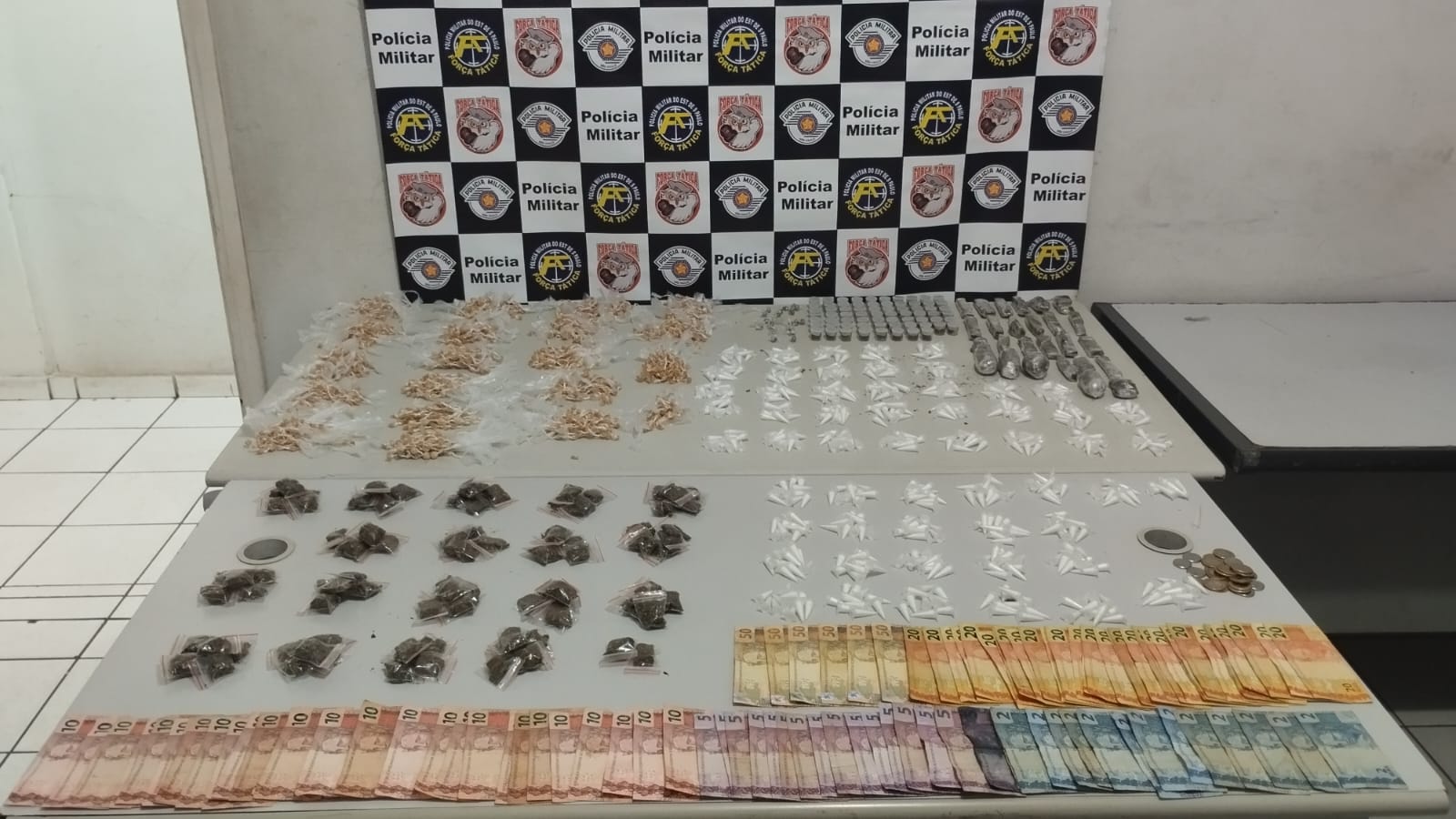 Na vistoria do material que estava com ele, foram encontradas diversas porções de drogas já fracionadas e prontas para comercialização, além de dinheiro em espécie.
