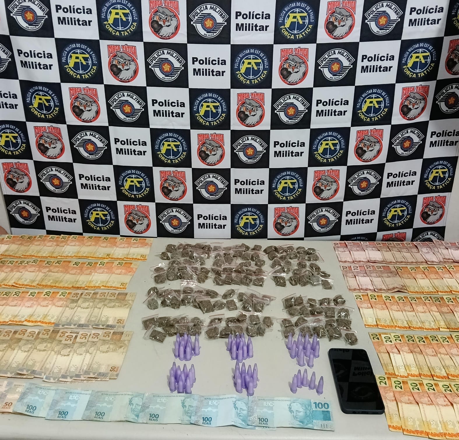 Um dos suspeitos, que carregava uma mochila, deixou o objeto cair durante a fuga e entrou rapidamente em uma residência, sendo prontamente acompanhado e abordado pelos policiais. Na revista pessoal, foi localizado um aparelho celular e a quantia de R$ 4 mil em dinheiro, armazenada em uma pochete.