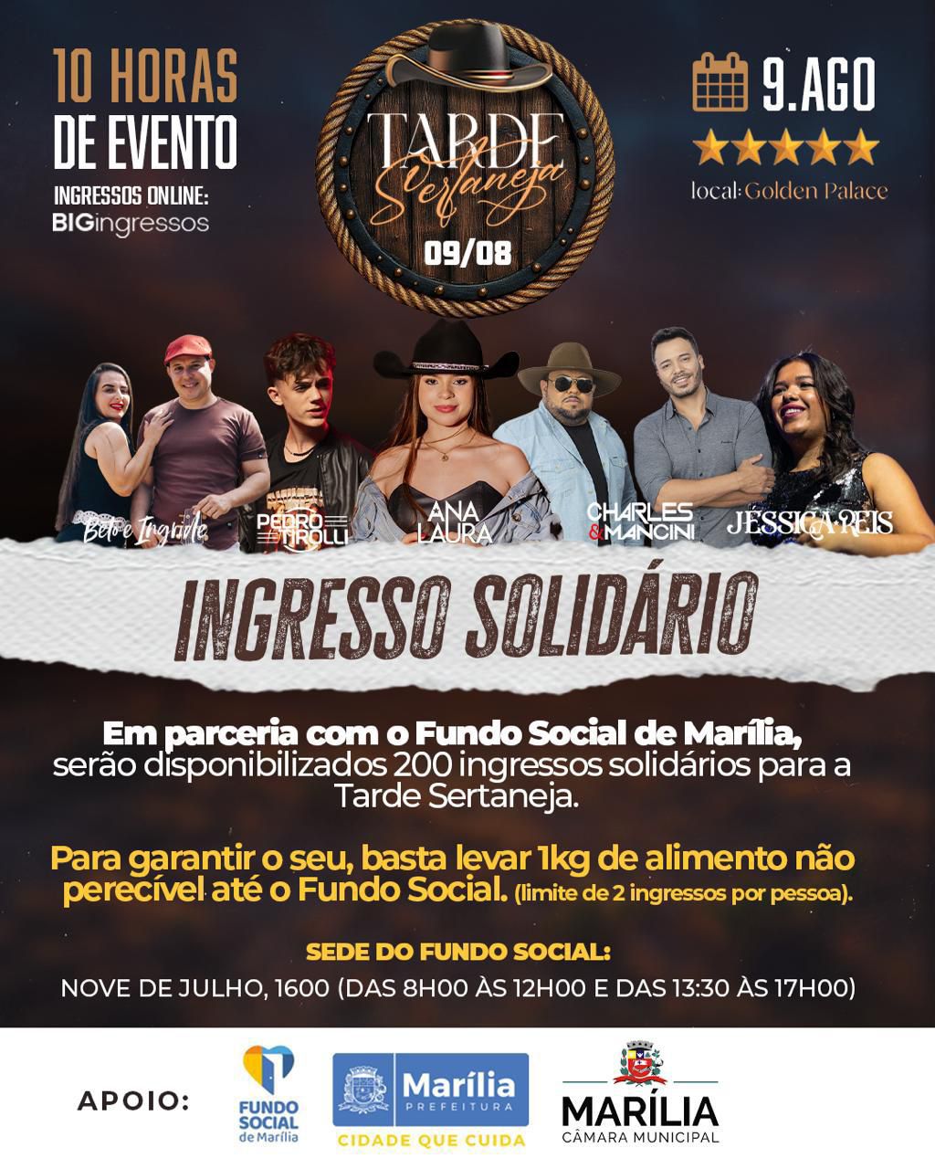 O Fundo Social de Marília iniciou a troca de ingressos solidários para a Tarde Sertaneja, evento que será realizado no dia 9 de agosto, no Golden Palace. Estão disponíveis 200 convites, que podem ser retirados por quem doar 1 kg de alimento não perecível por ingresso, diretamente na sede do Fundo Social.