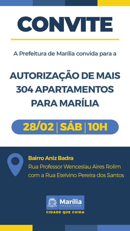 A Prefeitura de Marília anuncia neste sábado (28/02) a construção de 304 apartamentos no bairro “Dr. Aniz Badra”, na zona Norte da cidade. O evento será às 10h na Rua Professor Wenceslau Aires Rolim, esquina com a Rua Etelvino Pereira dos Santos.