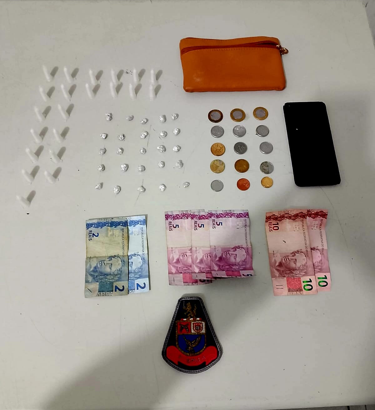 Durante a abordagem, os policiais encontraram a suspeita com uma bolsa atravessada no corpo. No interior dela havia 25 porções de crack, 21 pinos de cocaína, R$ 45,70 em dinheiro e um celular. Diante do material apreendido, ela recebeu voz de prisão no local.