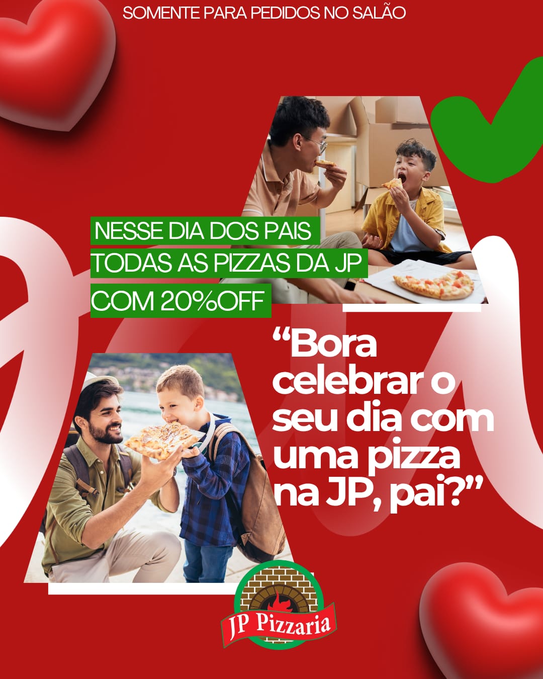 O Dia dos Pais vai ficar ainda mais gostoso na JP Pizzaria, a mais querida da cidade! Neste domingo, todos estão convidados a comemorar essa data especial no aconchegante salão da casa, que preparou uma oferta irresistível para homenagear os pais: 20% de desconto em todas as pizzas.