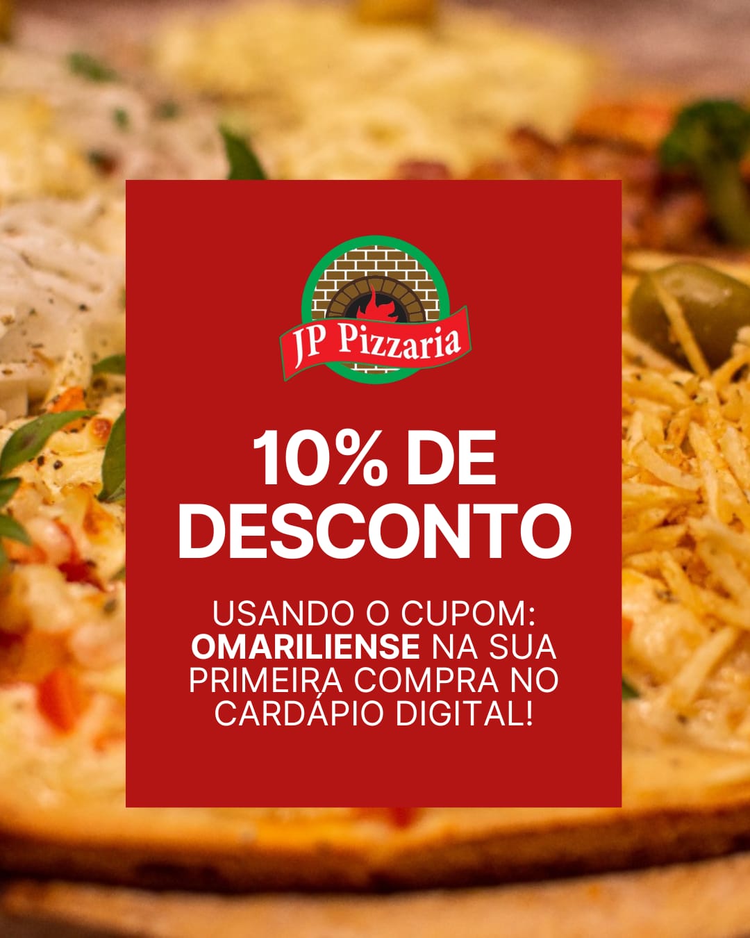 A pizzaria está localizada na Avenida Benedito Alves Delfino, 432, e atende pedidos pelo WhatsApp (14) 99824-1002. Para aproveitar o desconto especial, acesse o cardápio digital pelo link https://pedido.anota.ai/loja/jp-pizzaria-9?coupon=OMARILIENSE&f=csa e use o cupom OMARILIENSE na sua primeira compra.
