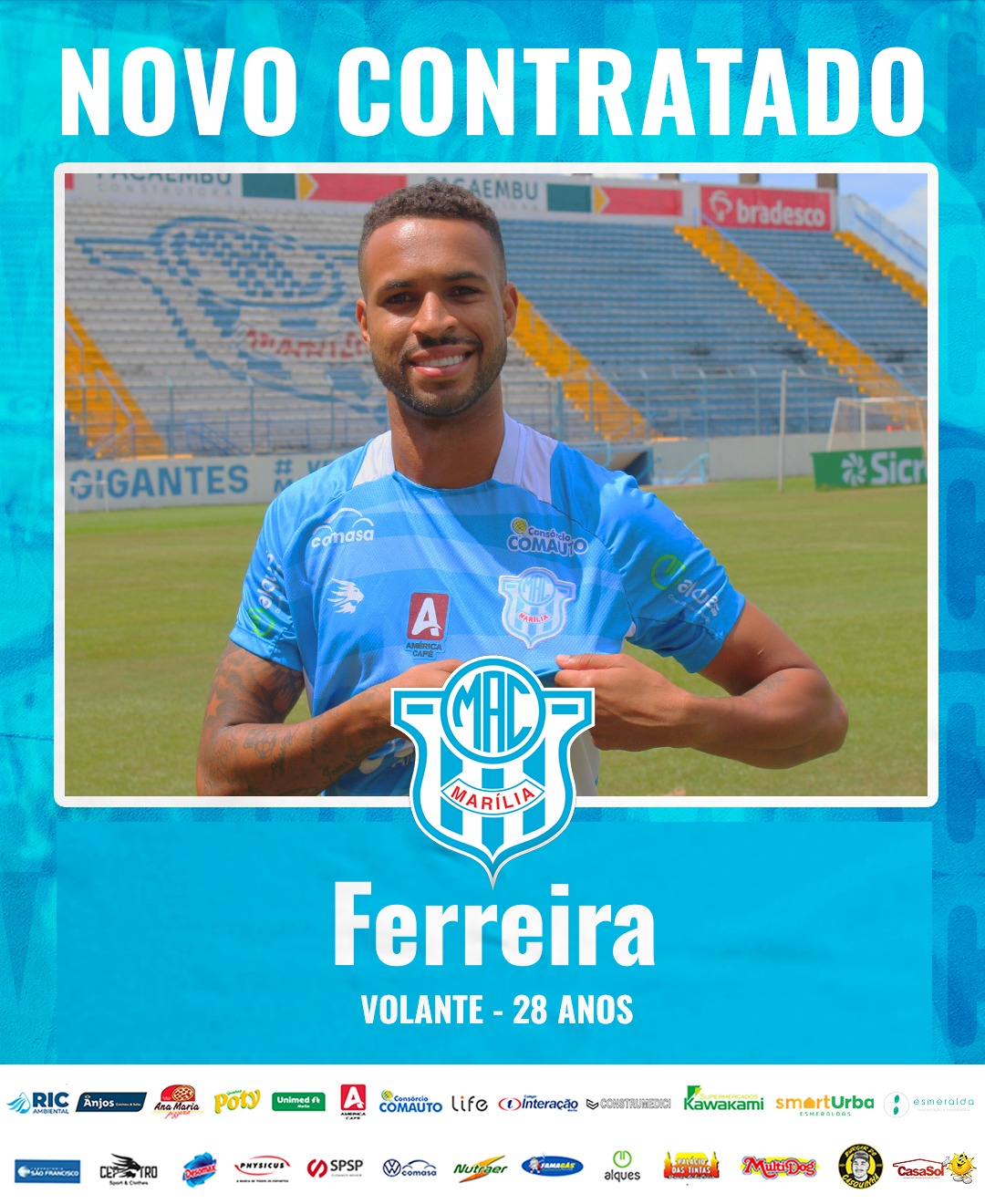 O Marília Atlético Clube (MAC) segue se reforçando para a disputa do Paulistão A3 e anunciou, nesta quinta-feira (20), a contratação do volante Ferreira, de 28 anos. O jogador chega ao clube após o zagueiro do Rio Branco-PR e traz experiência na competição, tendo atuado pelo Sertãozinho nas edições anteriores.