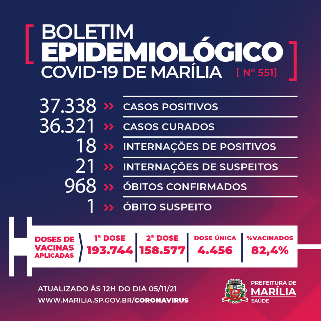 A Prefeitura de Marília confirmou na manhã desta sexta-feira, dia 5 de novembro, mais uma morte por Covid-19, chegando a 968 óbitos pela doença no município.