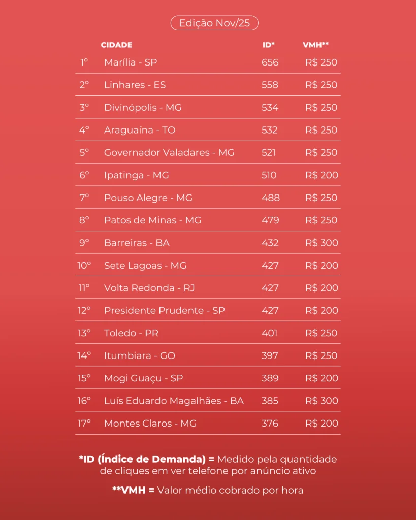 Marília aparece em destaque no novo levantamento da Fatal Model, maior plataforma de anúncios de acompanhantes do Brasil. Entre todas as cidades brasileiras com mais de 100 mil habitantes, o município conquistou a primeira colocação no Índice de Demanda (ID), alcançando 656 pontos — o maior índice registrado no país.