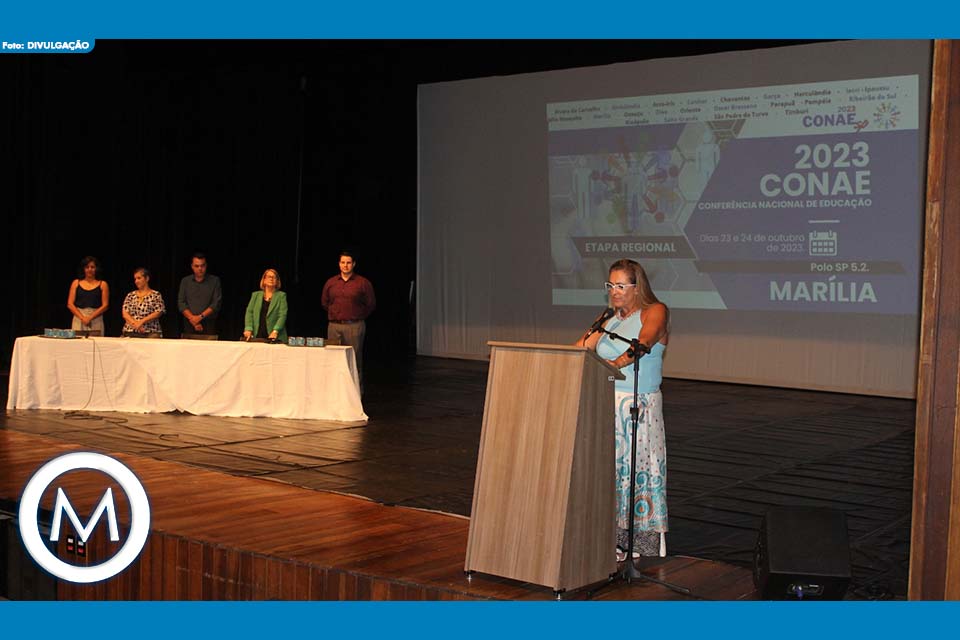Educadores de Marília e de outros 22 municípios da região, a exemplo de Álvaro de Carvalho, Garça, Oscar Bressane e Vera Cruz, participaram entre os dias 23 e 24 de outubro – segunda e terça-feira desta semana – da etapa regional da Conferência Nacional de Educação 2024. A solenidade de abertura ocorreu na noite de segunda-feira, dia 23, no Teatro Municipal ‘Waldir Silveira Mello’, no centro, e reuniu autoridades locais, a exemplo do secretário municipal da Educação, professor Helter Bochi – que na ocasião representou o prefeito de Marília, Daniel Alonso, dirigente regional de ensino de Marília, professora doutora Ana Luiza Bernardo Guimarães, presidente do Conselho Municipal de Educação, professor Marcelo de Souza Fermino, secretária municipal da Educação de Garça, professora Janete Aparecida Barros Arranha Conessa e a professora Flávia Lopes de Cerqueira Gimenes de Oliveira, coordenadora da comissão que organizou a etapa regional da conferência nacional.
