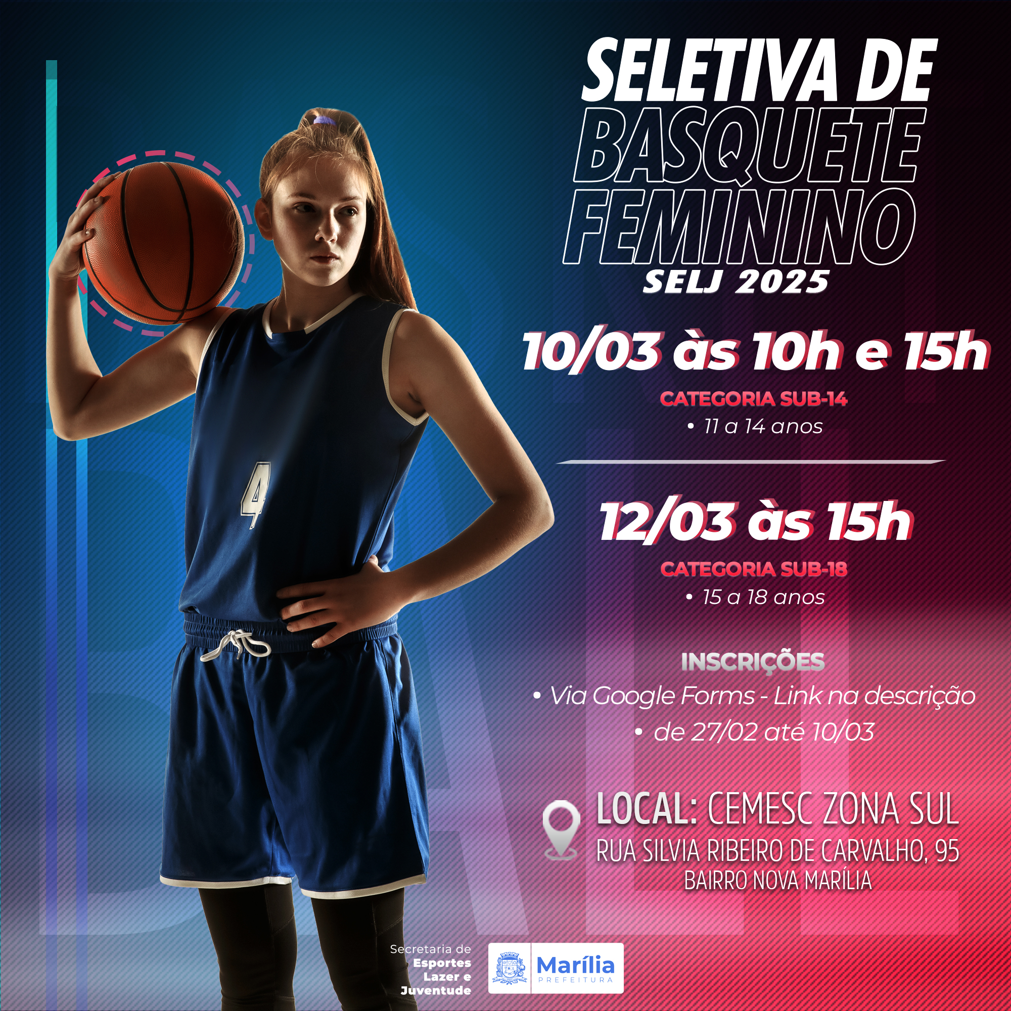 As inscrições poderão ser feitas através do link linktr.ee/BasqueteMarilia, clicando na opção “Peneira Basquete SELJ Marília”. Masculino até dia 04/03 e feminino até 10/03.