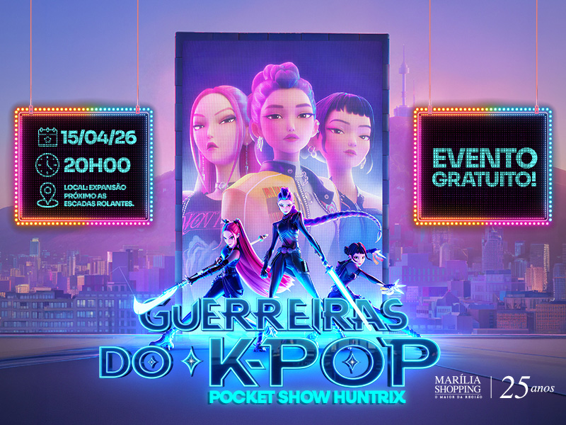 Nesse contexto, o Marília Shopping recebe na próxima quarta-feira (15), a partir das 20h, o pocket show “Huntrix – Guerreiras do K-Pop”. No palco, três guerreiras irão protagonizar uma apresentação vibrante, em que dança e música se entrelaçam para contar uma história de força, união e autoconfiança. Evento é gratuito.