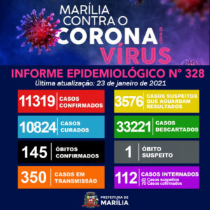 A Prefeitura de Marília, por meio da Secretaria Municipal da Saúde, confirmou na manhã deste sábado, dia 23 de janeiro, mais uma morte por Covid-19, chegando a 145 óbitos pela doença no município.