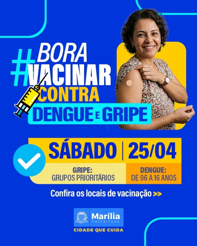 A Prefeitura de Marília, por meio da Secretaria Municipal da Saúde, confirmou na manhã desta quinta-feira (23) que seis unidades de saúde estarão abertas neste sábado, dia 25 de abril, das 10h às 16h, exclusivamente para vacinação contra a Influenza (gripe) dos grupos prioritários e dengue (faixa etária de 6 a 16 anos).