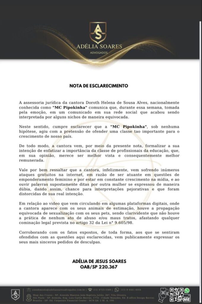 Após ter mais um show cancelado, dessa vez no Espírito Santo, a MC Pipokinha divulgou uma nota se desculpando pelas falas sobre os professores que gerou polêmica e causou revolta nas redes sociais durante esta semana.