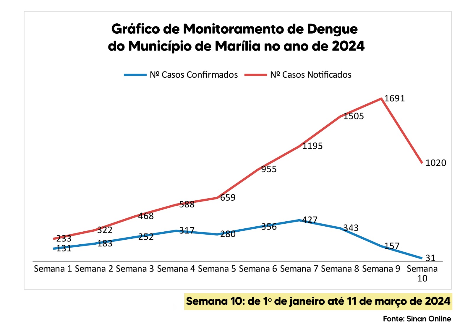 Pela 3ª semana consecutiva, conforme gráfico de monitoramento da Secretaria Municipal de Saúde de Marília, as notificações e confirmações da doença apresentaram queda. Desde a 7ª Semana os números estão caindo. O recuo é nitidamente notado nas semanas seguintes: a 8ª, 9ª e a 10ª, cujos dados epidemiológicos foram divulgados nesta quarta-feira, dia 13 de março de 2024. Conforme boletim epidemiológico da Vigilância Epidemiológica de Marília, até a 10ª Semana do ano (de 1º de janeiro a 9 de março de 2024) a cidade confirmou 2.477 casos de dengue e 5 mortes.