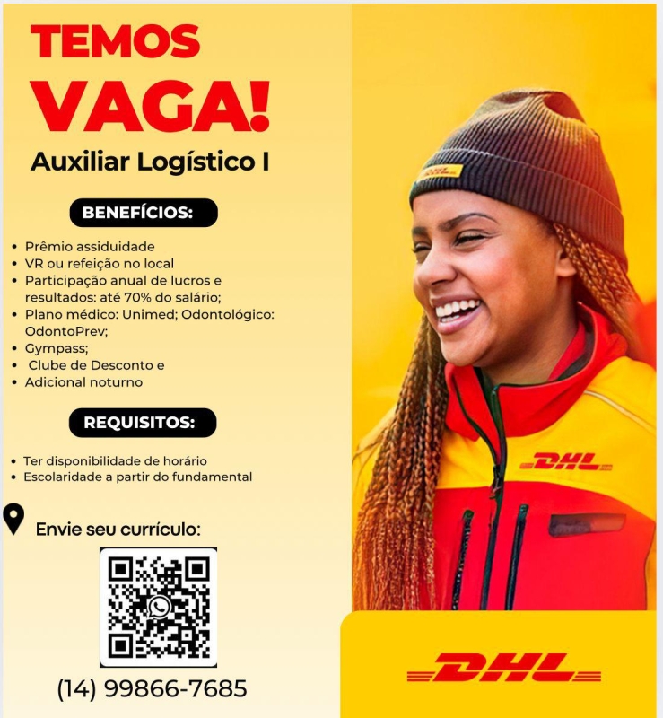 A Prefeitura de Marília, por meio da Secretaria Municipal do Trabalho, Turismo e Desenvolvimento Econômico, informa que a DHL, uma das maiores empresas de logística do mundo, realizará um mutirão de empregos no município com vagas para o cargo de Auxiliar Logístico I.