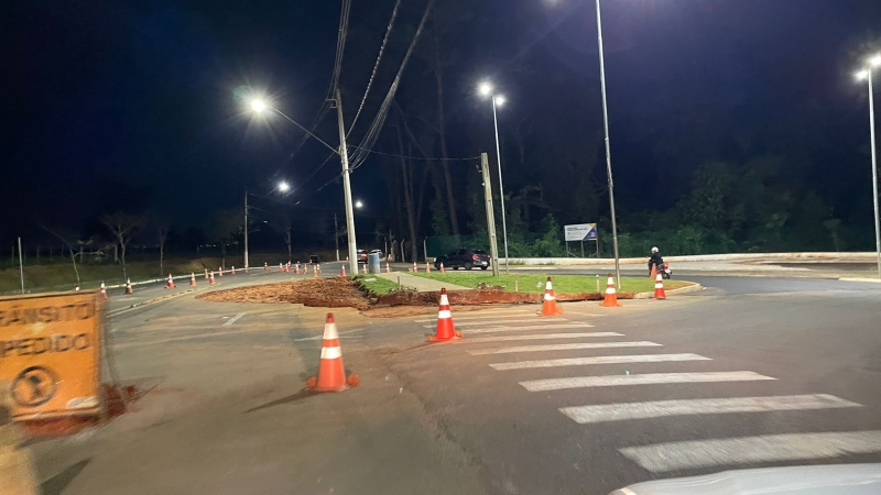Obras em rotatória próxima ao Bosque Municipal exigem atenção redobrada de motoristas