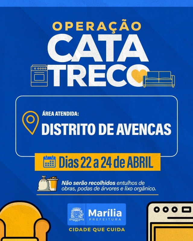 A Prefeitura de Marília, por meio da Secretaria Municipal do Meio Ambiente e Serviços Públicos, realizará entre os dias 22 e 24 de abril mais uma edição da Operação Cata-Treco, desta vez no distrito de Avencas. A ação tem como objetivo auxiliar os moradores no descarte adequado de materiais inservíveis, contribuindo para a organização da cidade e a prevenção de problemas de saúde pública.