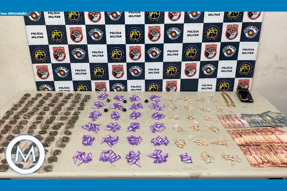 Com ele, os policiais militares apreenderam 245 pinos de cocaína, 190 pedras de crack embrulhadas em plástico transparente, 104 porções de maconha também em plástico transparente, 5 porções de raxixe, além de R$ 275,00 em notas diversas e um aparelho celular.