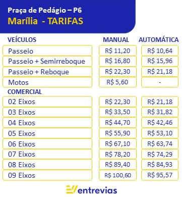 A Entrevias Concessionária de Rodovias divulgou a informação de que a partir da zero hora desta quarta-feira (22), haverá mudança nos valores das tarifas de pedágio da praça localizada no município de Marília, no quilômetro 315 da SP-333 (Rodovia Dona Leonor Mendes de Barros).
