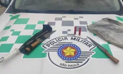 No local, os policiais encontraram uma bolsa com facas, dois cartuchos calibre 28 deflagrados e uma armadilha artesanal usada para capturar animais.