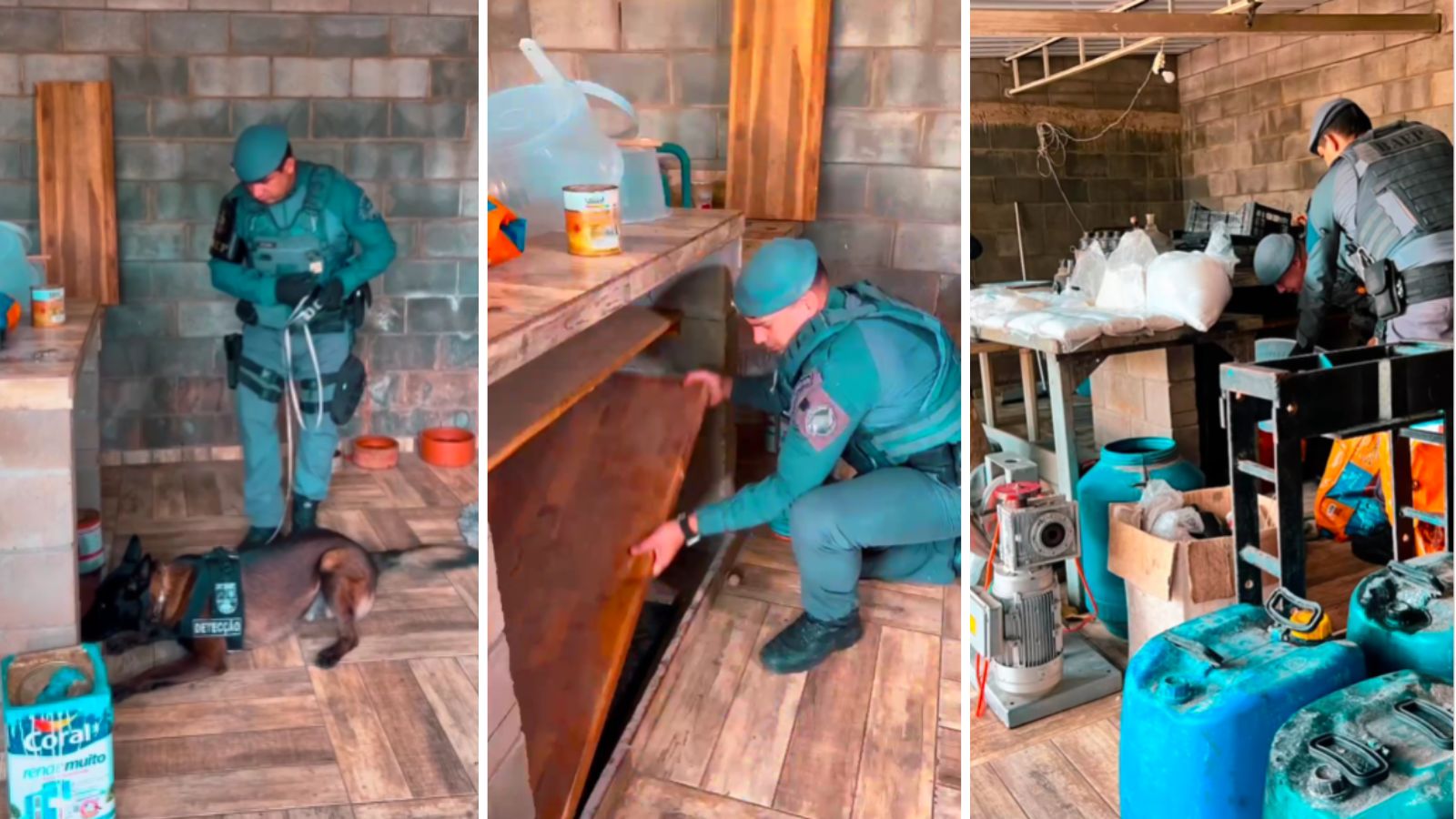 O cão farejador do 10° Baep foi crucial para o encontro do bunker. Ele apontou para um local embaixo de um balcão, onde havia um compartimento secreto que dava acesso à estrutura.