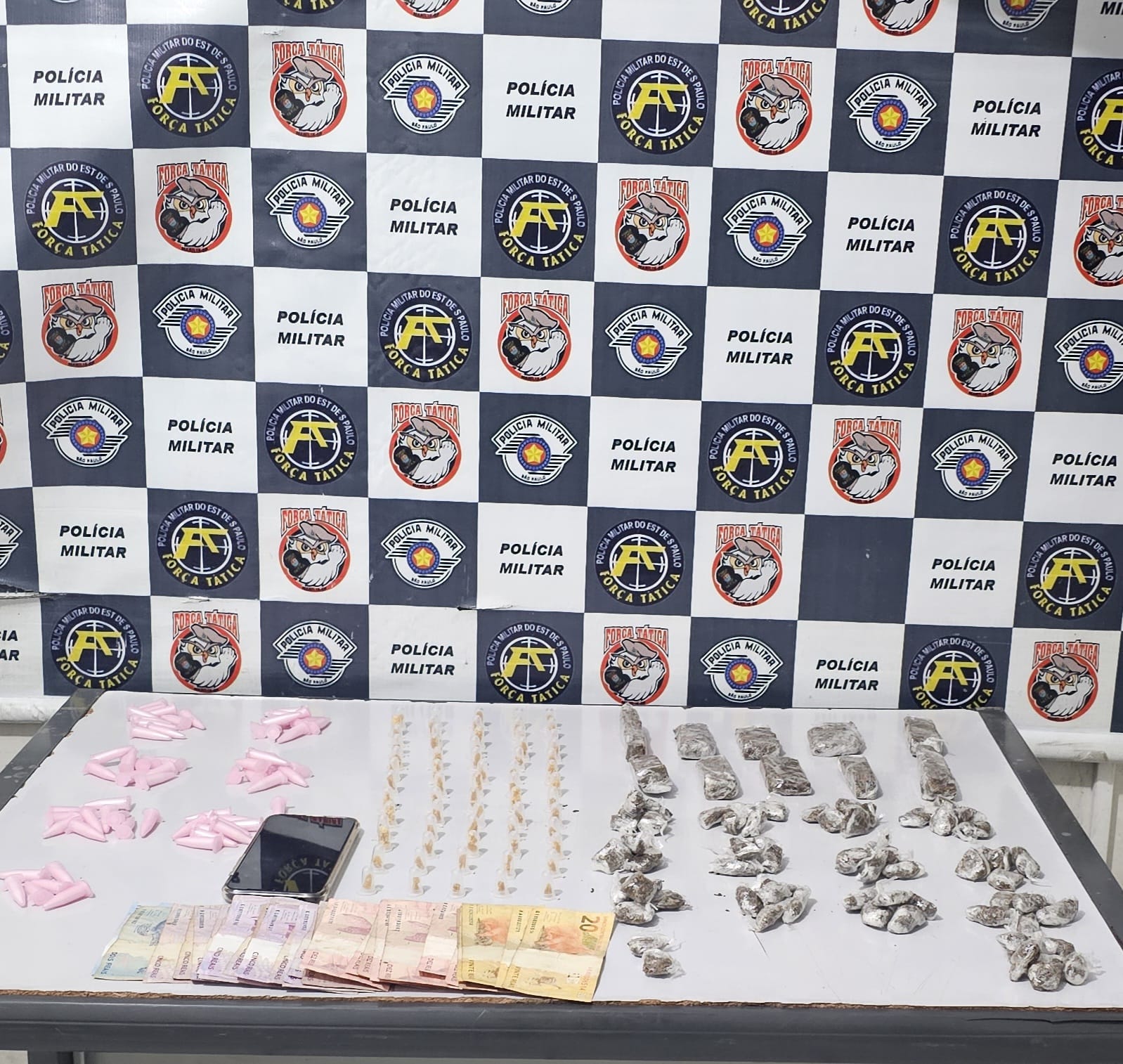 O flagrante aconteceu por volta das 17h, durante um patrulhamento de Força Tática. Os policiais avistaram um indivíduo que demonstrou comportamento suspeito ao se deparar com as viaturas. Ao realizarem a abordagem, os agentes encontraram R$ 244 em notas diversas nas vestes do suspeito e, no saco plástico que ele carregava, foram localizados 66 microtubos de cocaína, 65 microtubos de crack e 78 porções de maconha.
