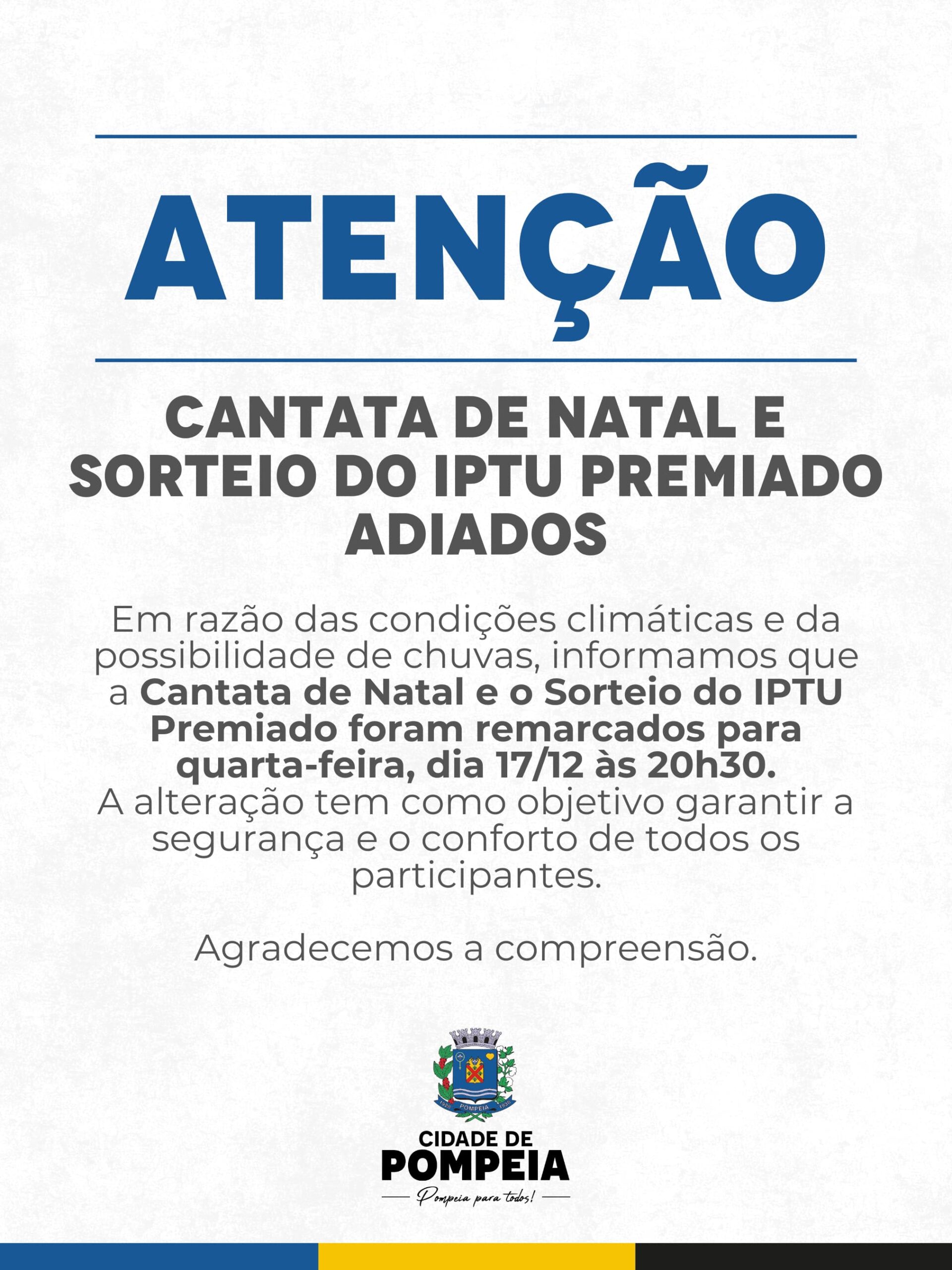 A Prefeitura Municipal de Pompeia informou que a Cantata de Natal com Sorteio do IPTU Premiado, prevista para acontecer neste sábado, 13 de dezembro, foi remarcada em razão das condições climáticas e da possibilidade de chuvas.