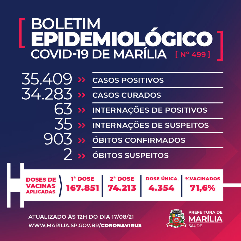 A Prefeitura de Marília confirmou na manhã desta terça-feira, dia 17 de agosto, mais uma morte por Covid-19, chegando a 903 óbitos pela doença no município.