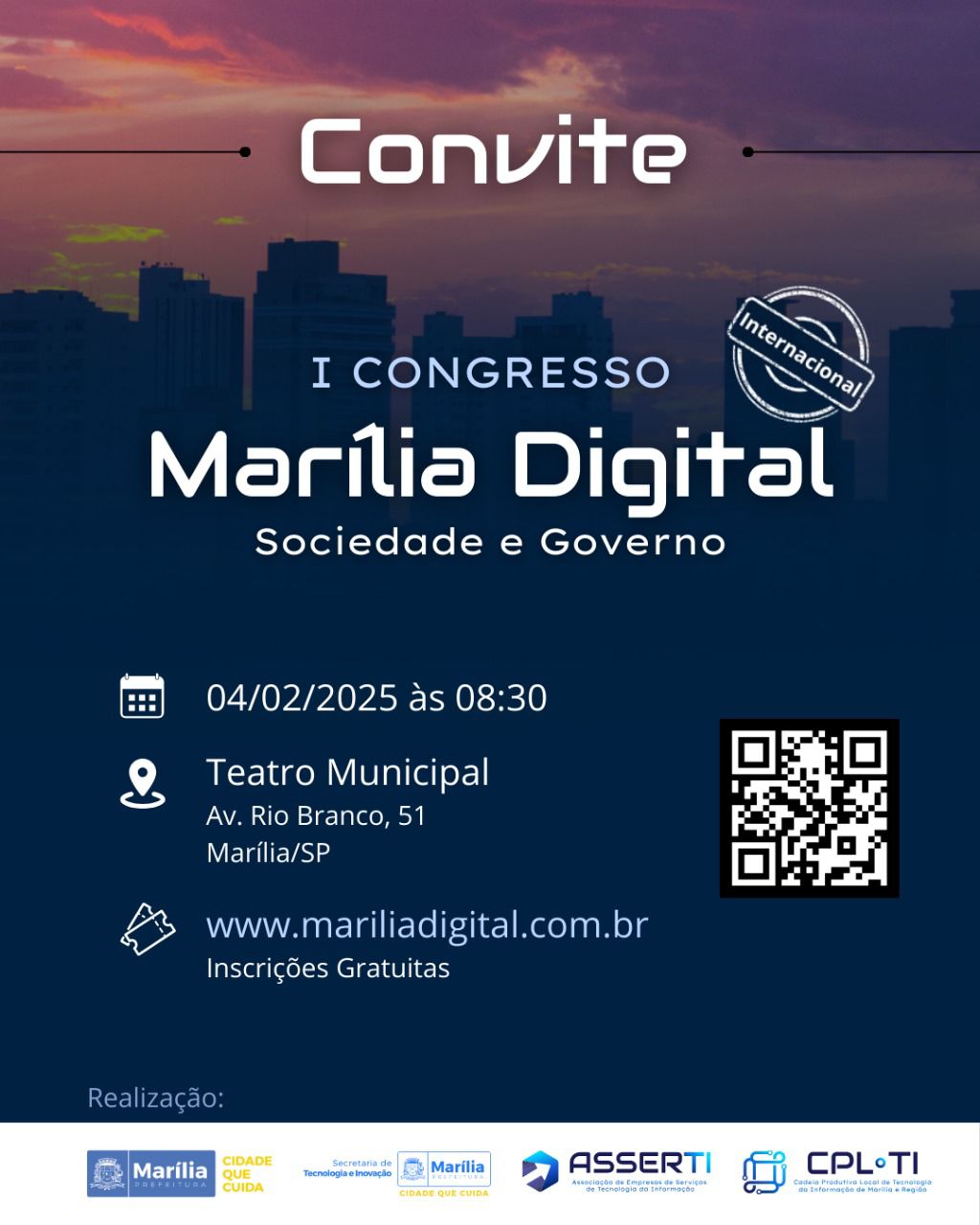 A Prefeitura de Marília, por meio da Secretaria Municipal de Tecnologia e Inovação, e a Asserti (Associação de Empresas de Serviço de Tecnologia da Informação) realizam nesta terça-feira (4), a partir das 8h30, no Teatro Municipal Waldir Silveira Mello, o I Congresso Marília Digital.