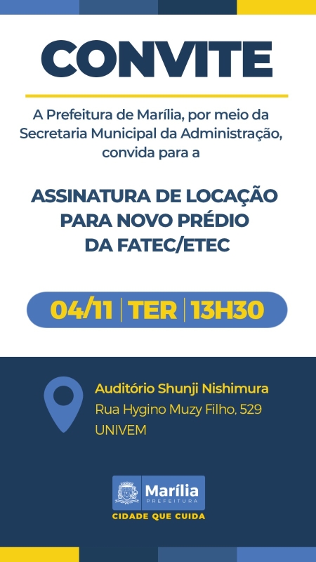 A solenidade de assinatura do contrato de locação será realizada às 13h30 da próxima terça-feira, 4 de novembro – exatamente dois meses após o anúncio do prefeito com a solução para melhorar as condições de ensino do Centro Paulo Souza (CPS), em Marília representado pela Etec e pela Fatec.