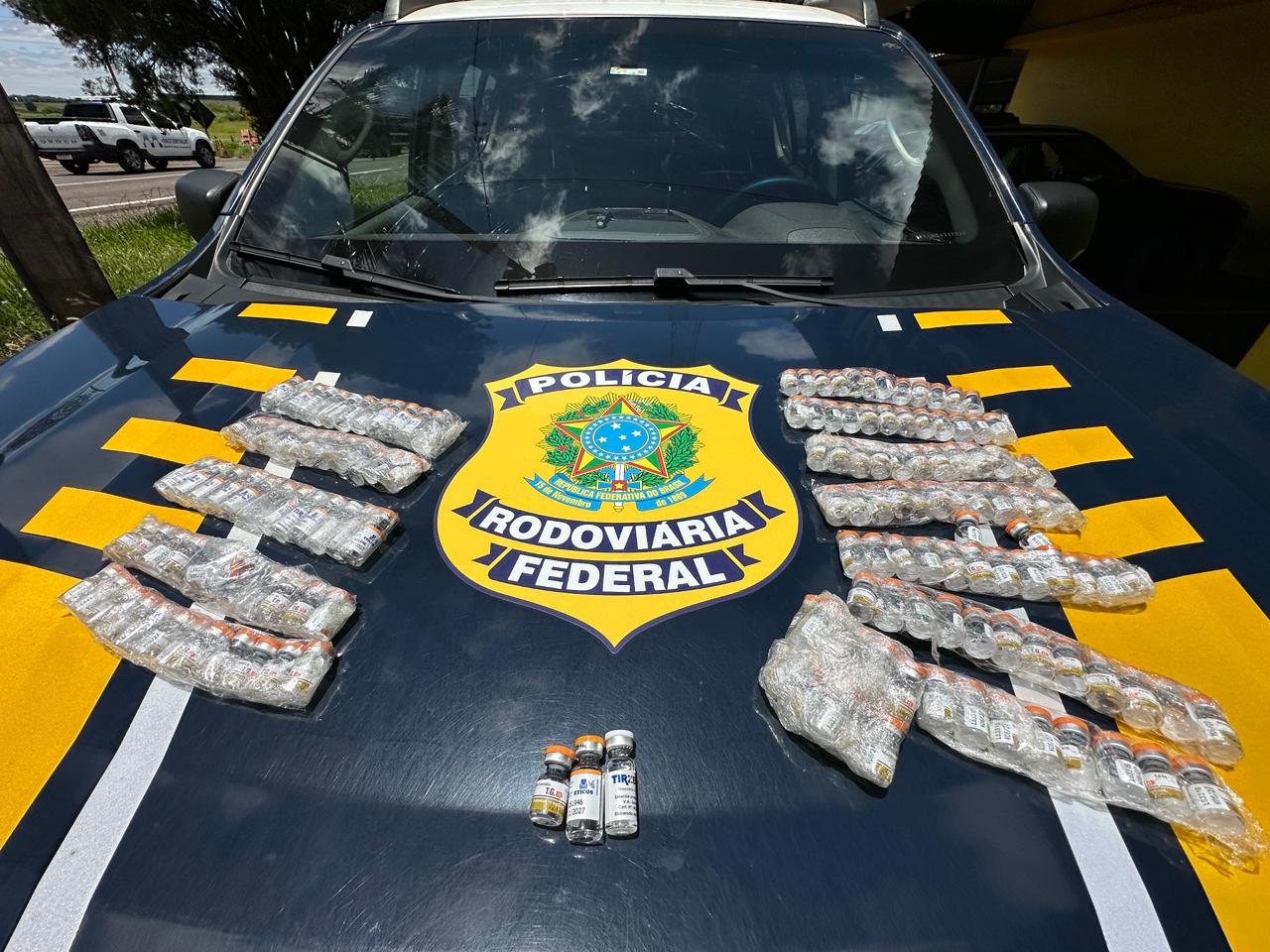 Diante das informações contraditórias, os policiais realizaram uma vistoria mais minuciosa no automóvel e encontraram diversas ampolas de medicamentos de uso controlado escondidas dentro de garrafas térmicas. Ao todo, foram localizadas 153 unidades, de diferentes marcas.