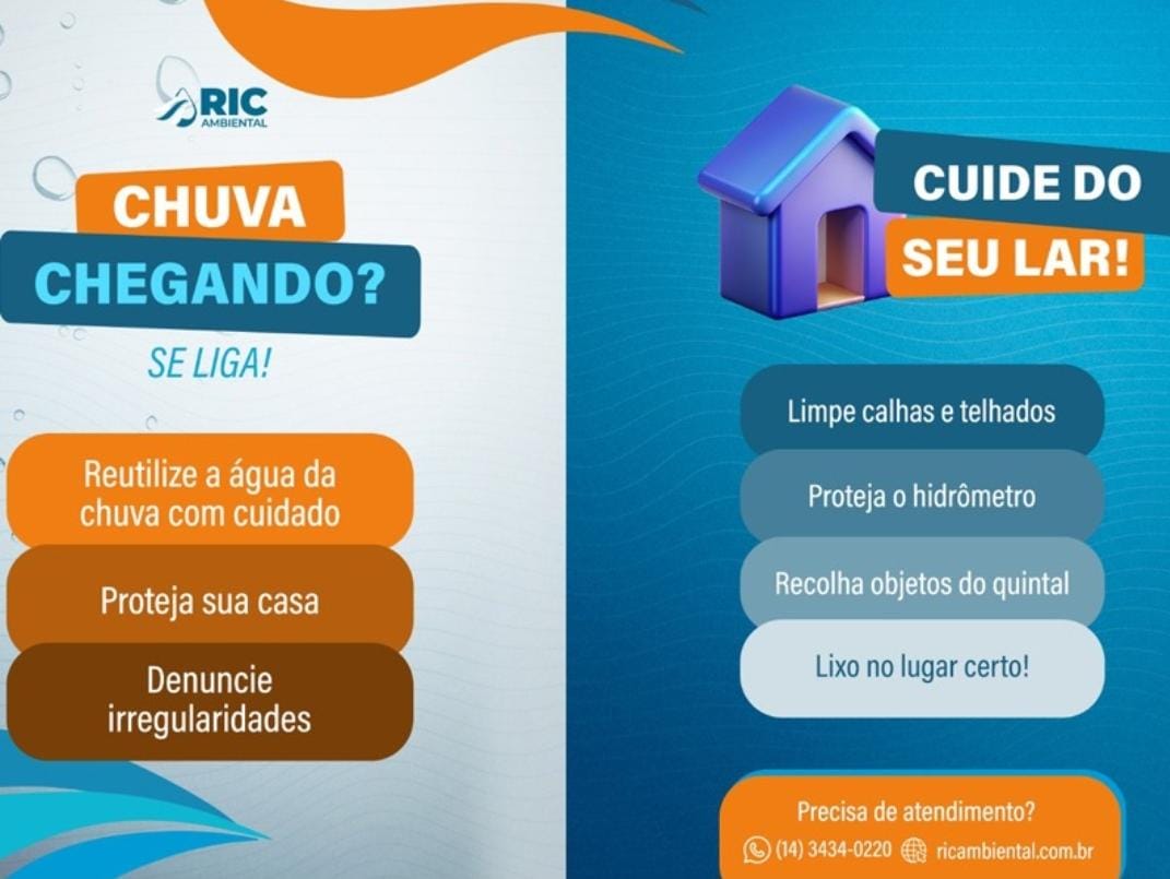 Com chuvas intensas previstas para Marília e região, a RIC Ambiental, responsável pelos serviços de água e esgotamento sanitário, orienta a população sobre como aproveitar os benefícios desse período de forma segura e consciente. A chuva é um recurso natural fundamental para a recomposição dos mananciais e o equilíbrio do sistema de abastecimento, mas também exige atenção a riscos como alagamentos, contaminações e danos à infraestrutura urbana e domiciliar.
