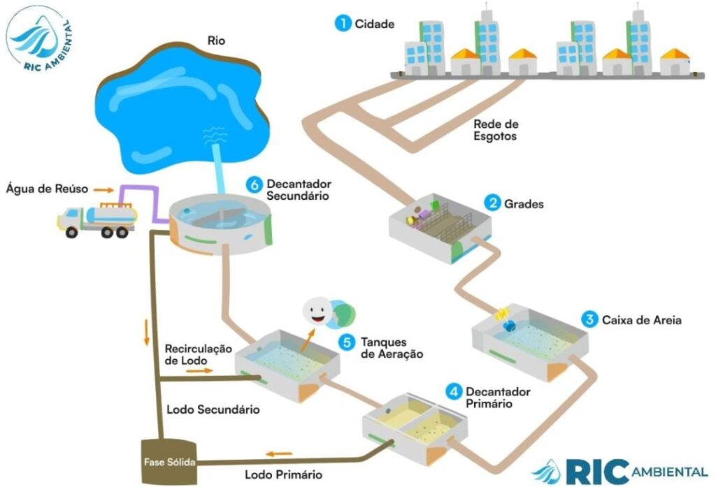 Após o tratamento, o efluente tratado é devolvido ao meio ambiente (geralmente a corpos hídricos) de forma segura, respeitando os parâmetros legais de qualidade. Os resíduos sólidos gerados durante o processo (lodo) são encaminhados para aterros sanitários ou reutilizados, conforme viabilidade técnica.