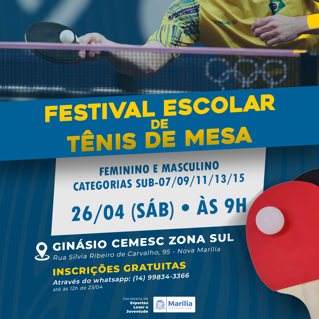 O evento será realizado no dia 26 de abril, a partir das 9h, no CEMESC Zona Sul, na rua Sílvia Ribeiro de Carvalho, 95, bairro Nova Marília. Poderão se inscrever alunos de escolas públicas municipais, estaduais e particulares, nas categorias feminina e masculina sub-07, sub-09, sub-11, sub-13 e sub-15.
