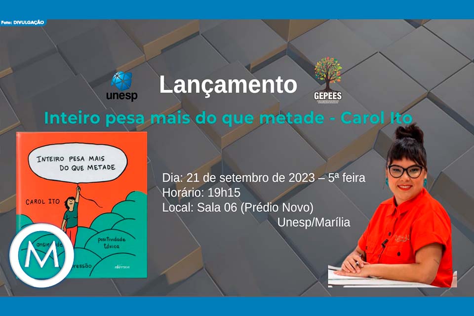 Nesta quinta-feira, dia 21 de setembro de 2023, a partir das 19h15, a Faculdade de Filosofia e Ciências, da Unesp, Campus de Marília, promoverá o lançamento do livro de Carol Ito, de Marília, intitulado Inteiro pesa mais que metade. A autora é quadrinista, jornalista e mestre em Ciência da Informação pela ECA-USP. Trabalha com cartuns, tiras de humor e jornalismo em quadrinhos desde 2014 e já publicou seus trabalhos em veículos como Revista Piauí, Revista Tpm e Agência Pública. É vencedora do prêmio Vladimir Herzog de Anistia e Direitos Humanos de 2022, na categoria “Arte”, e destaque na lista Forbes Under 30, da Revista Forbes Brasil, na categoria “Literatura e artes plásticas”. Foi a primeira mulher a desenhar charges ao vivo no programa Roda Viva, da TV Cultura, em março de 2023.